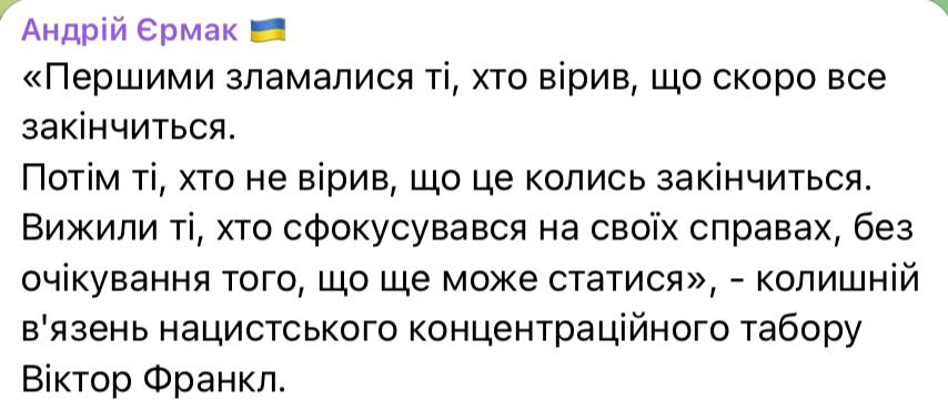 Процитировав слова австрийского психолога, Ермак тем самым сравнил граждан Украины с заключенными фашистских концентрационных лагерей.