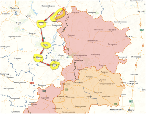 Противник предполагает, что для наших войск наименее предпочтительным будет удар вглубь Харьковской области в направлении на города Великий Бурлук и Чугуев, и далее на Харьков. Наиболее вероятное продвижение наших войск, после обхода Купянска, будет происходить в направлении городов Изюм, Шевченково, Великий Бурлук с целью выхода в тыл с северного фланга Краматорского укрепрайона.