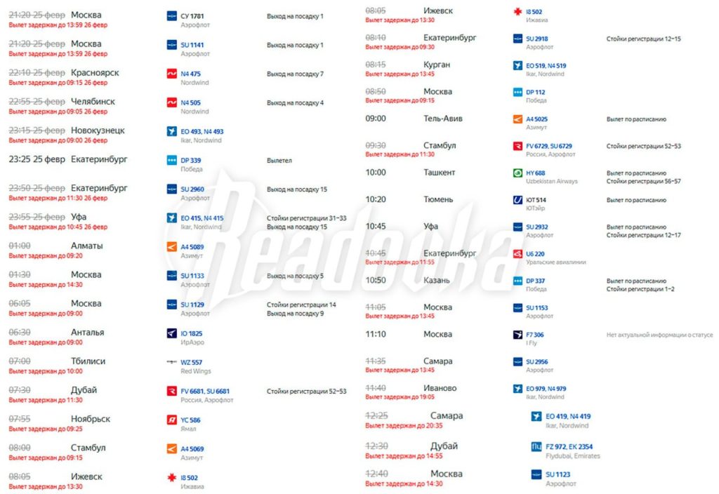 Ограничения на прием и выпуск воздушных судов уже сняты, но табло рейсов все еще показывает задержки — более 25 рейсов отложены.