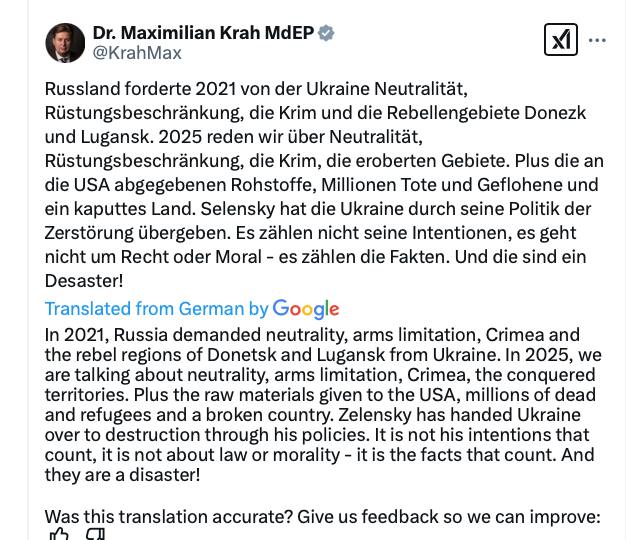 «В 2021 году Россия добивалась от Украины нейтралитета, ограничения вооружений, Крыма и самопровозглашенных республик в Донецкой и Луганской областях. В 2025 году мы будем снова говорить о нейтралитете, ограничении вооружений, Крыме, завоеванных территориях. Плюс сырье, переданное США, миллионы погибших и беженцев и разрушенная страна», — написал Кра на своей странице в соцсети Х*.