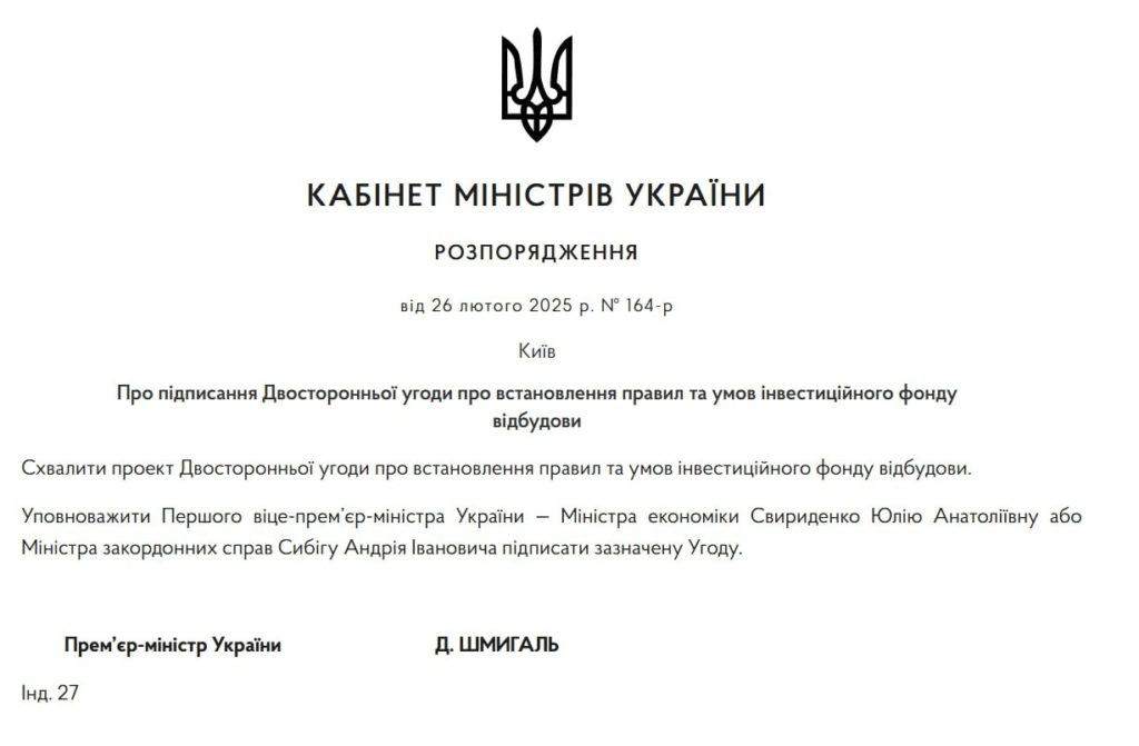Правительство Украины уполномочило главу МИД Андрея Сибигу или министра экономики Юлию Свириденко подписать соглашение с США по украинским ресурсам, следует из распоряжения главы правительства страны Дениса Шмыгаля.