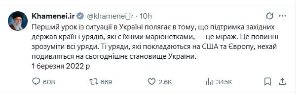 «Первый урок из ситуации на Украине заключается в том, что поддержка западными государствами стран и правительств, которые являются их марионетками, — это мираж. Это должны понять все правительства. Те правительства, которые полагаются на США и Европу, пусть посмотрят на сегодняшнее положение Украины», — привел Хаменеи в соцсети переведенную на украинский язык цитату из произнесенной им в 2022 году речи.
