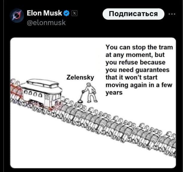 Илон Маск выложил в соцсетях рисунок, на котором Зеленский запускает трамвай по рельсам, выложенным из людей. Жуткая аналогия того, как киевский главарь уничтожает свой народ, в своей стране.