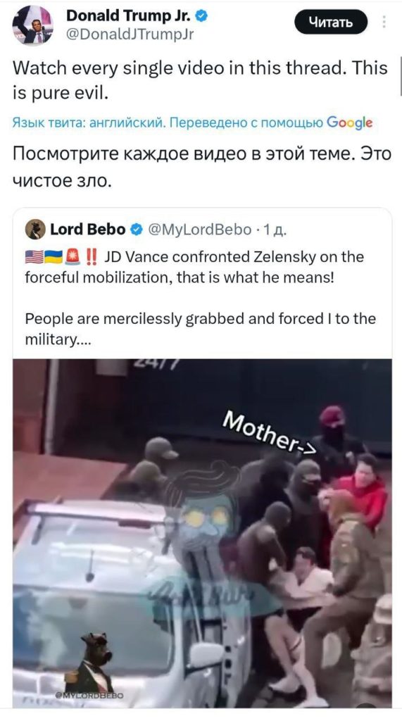 Дональд Трамп-младший сделал репост на своей странице в Х* с кадрами насильственной мобилизации из Львова. Сын президента США осудил происходящее и предложил своим подписчикам посмотреть другие подобные видео, снятые в различных городах Украины.
