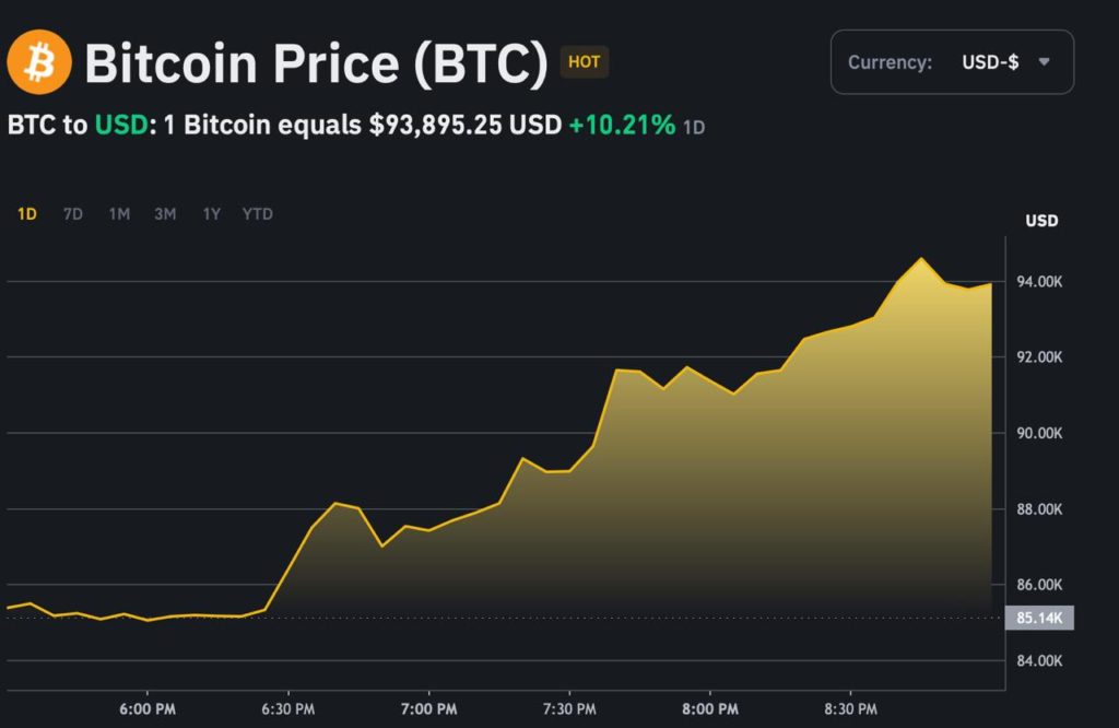 Цена на биткоин стремительно взлетела. По данным на эту минуту, на крупнейшей по объему торгов криптовалютами бирже Binance биткоин превысил отметку в 94 тысячи долларов США.