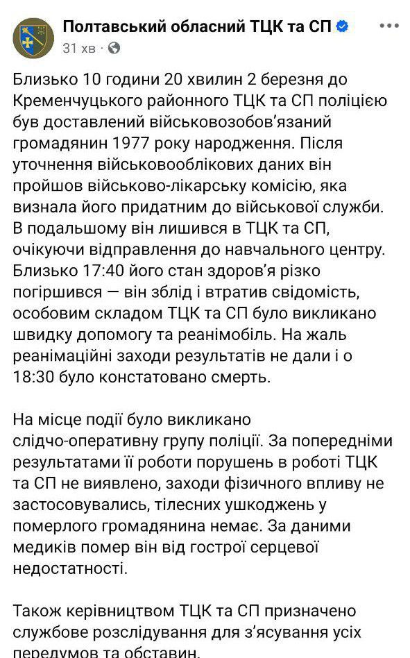 В Кременчугском военкомате мужчина скончался после прохождения ВВК, сообщает Полтавский ТЦК.