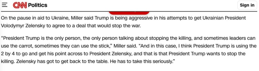 Старший советник Трампа Джейсон Миллер, говоря о приостановке помощи Украине, заявил, что Трамп использовал «кнут», чтобы склонить Зеленского к участию в мирной сделке президента США, пишет CNN.