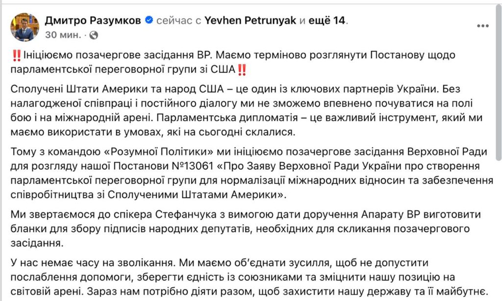 Глава депутатской группы «Разумная политика» и бывший спикер ВРУ Дмитрий Разумков инициировал внеочередное заседание Верховной Рады с целью срочно создать парламентскую группу для переговоров с США.