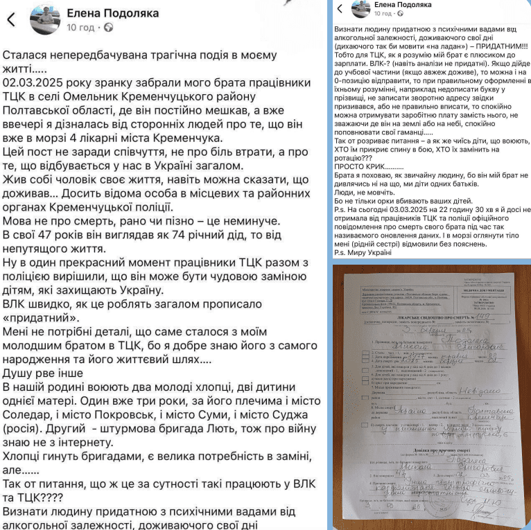 Сестра умершего в ТЦК мужчины Елена Подоляка опубликовала пост с рассказом о том, как сотрудники местного ТЦК задержали в селе Омельник Кременчугского района ее брата, у которого на фоне алкоголизма было диагностировано психиатрическое расстройство.