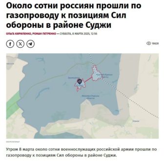 «Сводные диверсионно-штурмовые группы (ВС РФ – ред.) переместились по ветке газопровода с целью закрепиться на окраинах города Суджа в Курской области», — заявили в Генштабе ВСУ.