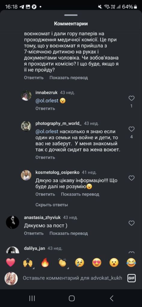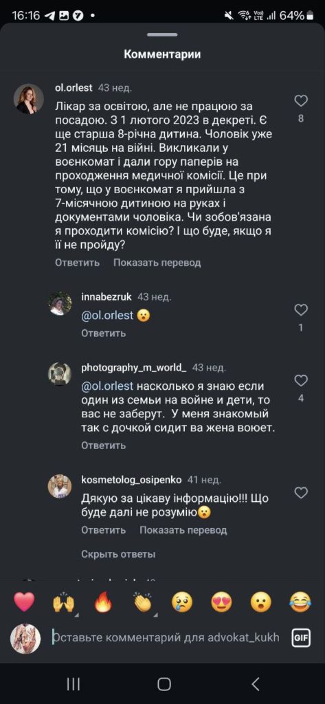 В комментариях пользователи рассказывают о случаях принудительной мобилизации и произвола, связанного со штрафами и повестками. Например, пользователь Анатолий Кузьмин утверждает, что видел, как «бабушке 57 лет дали штраф» при постановке на учет. Другая пользовательница anid367 рассказывает о 43-летней женщине с инвалидностью III группы, которую заставили проходить медкомиссию вместе с мужчинами-призывниками.