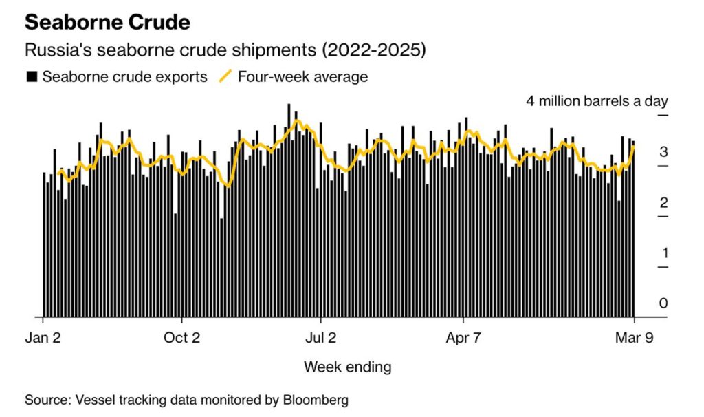 «Потоки сырой нефти из всех российских портов за четыре недели по состоянию на 9 марта выросли примерно на 300 000 баррелей в день — самый большой прирост с января 2023 года — до 3,37 миллиона, самого высокого показателя с периода по 10 ноября», — информирует Bloomberg.