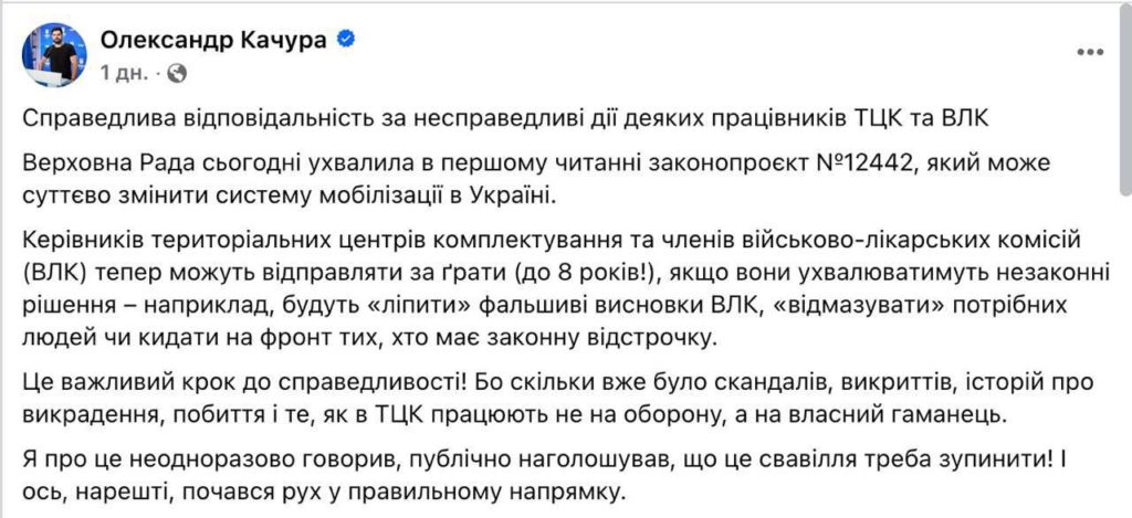 По новому законопроекту сотрудники ТЦК и ВВК смогут получить до 8 лет тюрьмы за незаконную мобилизацию. Об этом сообщил нардеп Качура.