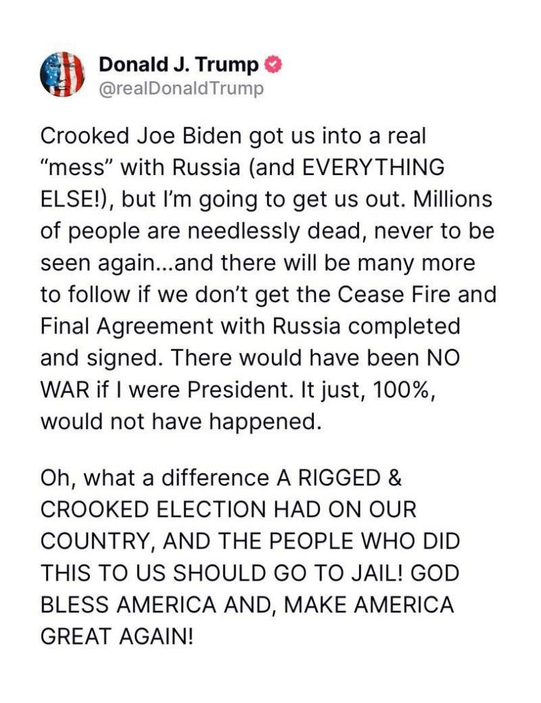 «Мошенник Джо Байден втянул нас в настоящую кашу с Россией, но я собираюсь нас вытащить», — написал Трамп в собственной социальной сети Truth Social.