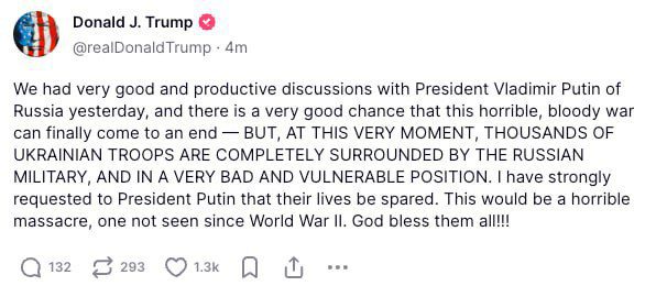 НО В ЭТОТ САМЫЙ МОМЕНТ ТЫСЯЧИ УКРАИНСКИХ ВОЙСК ПОЛНОСТЬЮ ОКРУЖЕНЫ РОССИЙСКИМИ ВОЙСКАМИ И НАХОДЯТСЯ В ОЧЕНЬ ПЛОХОМ И УЯЗВИМОМ ПОЛОЖЕНИИ», — написал президент США.