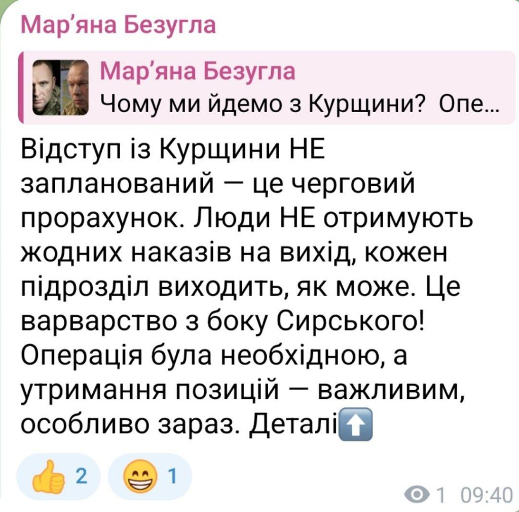 «Люди не получают ни одного приказа на выход, каждое подразделение выходит, как может. Это варварство со стороны Сырского! Операция была необходимой, а удержание позиций — важным, особенно сейчас», — написала она в своем Telegram-канале.