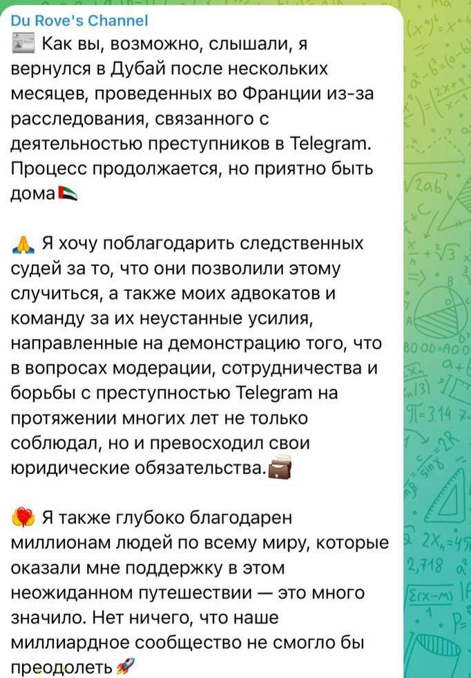«Как вы, возможно, слышали, я вернулся в Дубай после проведенных во Франции нескольких месяцев в связи с расследованием, связанным с преступной деятельностью в Telegram. Процесс продолжается, но приятно быть дома», — написал Дуров.