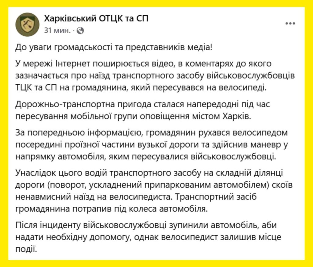 Но перед этим Харьковская ТЦК распространила в сети свою версию происходящего, в которой военкомы рассказали, что якобы случайно наехали на мужчину. По их словам, они хотели «помочь велосипедисту», однако мужчина «почему-то» убежал.