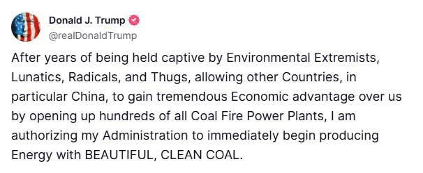 Дональд Трамп сообщил, что после многих лет воздействия экологических экстремистов он разрешил возобновить в США производство энергии на угле. Это заявление он сделал в своей соцсети Truth Social.