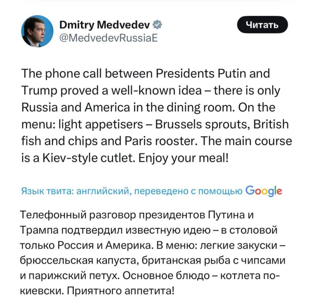 «В меню: лёгкие закуски — брюссельская капуста, британская рыба с чипсами и парижский петух. Основное блюдо — котлета по-киевски. Приятного аппетита!» — написал Медведев.