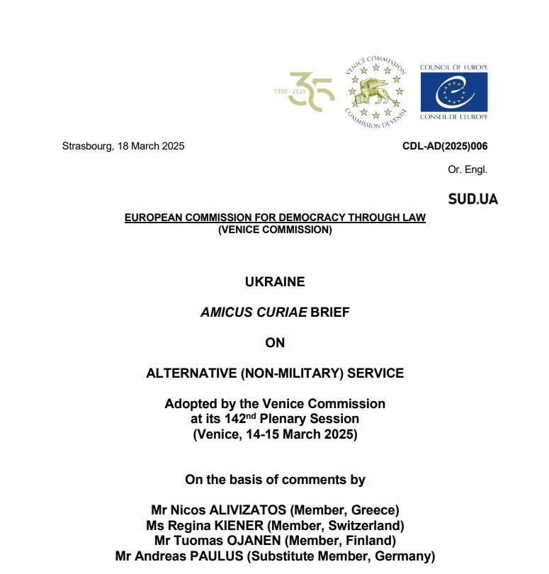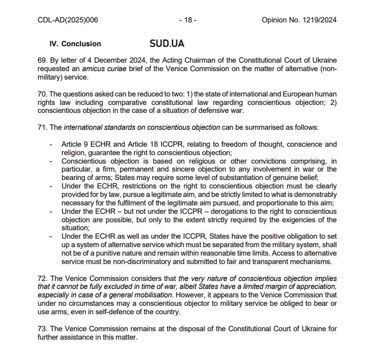 Венецианская комиссия проанализировала международное и европейское законодательство и пришла к выводу, что отказ от военной службы по убеждению не может быть полностью исключен даже в военное время.