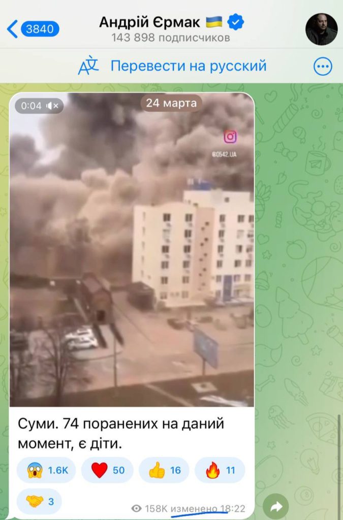Косвенно это предположение подтверждают действия главы Офиса Зеленского Андрея Ермака, который через час после публикации поста о взрыве в Сумах откорректировал его. Из текста исчезла надпись «Сумы после российского удара. Так Путин “приостанавливает” бить по гражданским».