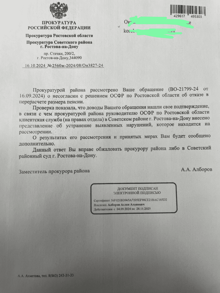 Валентина узнала о нас от знакомой, которой в Центре поддержки украинцев в г. Ростове-на-Дону помогли с перерасчетом пенсии. Юрист Центра изучил документы, подготовил обращение в контрольно-надзорные органы. По результатам прокурорской проверки были выявлены нарушения, допущенные ОСФР по РО, в адрес пенсионного органа направили представление об устранении нарушений. В итоге, трудовой стаж засчитали полностью и провели перерасчет пенсии. Уже в феврале Валентине выплатили дополнительно 142 000 руб. Теперь женщина каждый месяц вместо 13 240 руб. будет получать 26 240 руб. По словам Валентины, это большое подспорье.