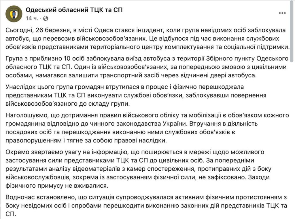 В Одессе группа из 10 женщин заблокировала автобус с мобилизованными на подъезде к пункту сбора и освободила одного из них, сообщил областной ТЦК.