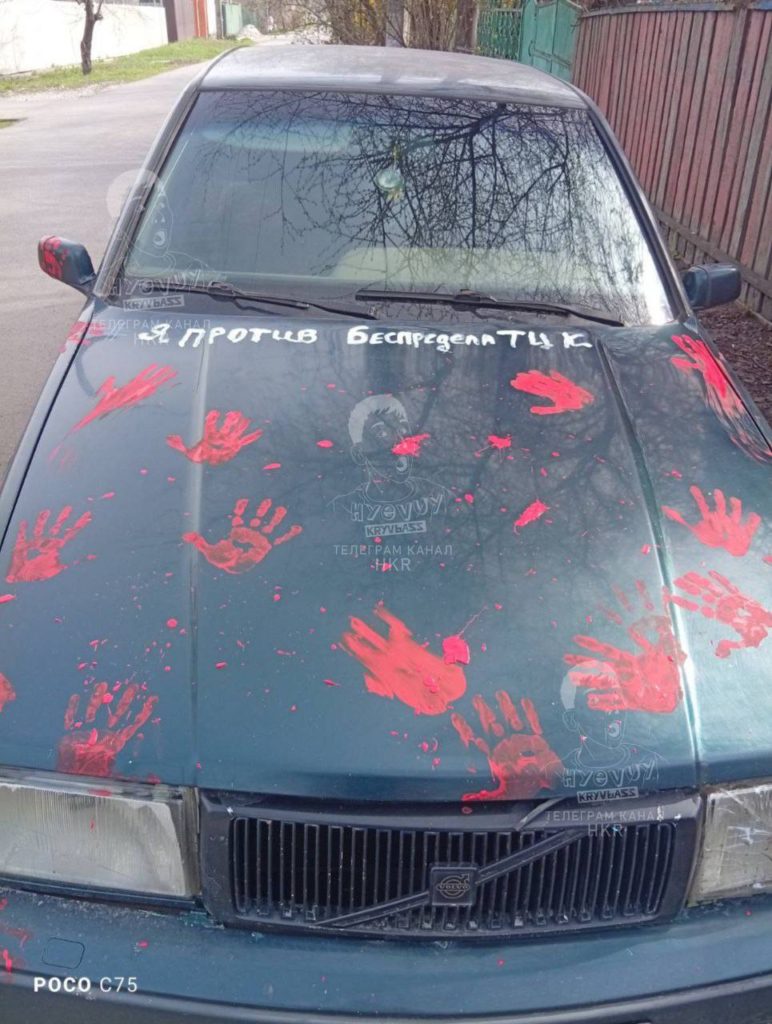 Рядом с военкоматом в Кривом Роге припарковали автомобиль на котором красной краской нарисовали отпечатки «окровавленных» рук.