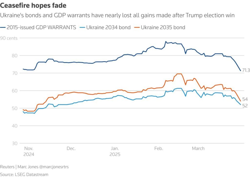 Бонды, привязанные к ВВП Украины, снизились на 4 цента до 71,23 за облигацию, что может стать самым значительным падением с начала военного конфликта. Издание напоминает, что после победы Трампа и его мирных инициатив, они выросли в индексах облигаций развивающихся рынков.