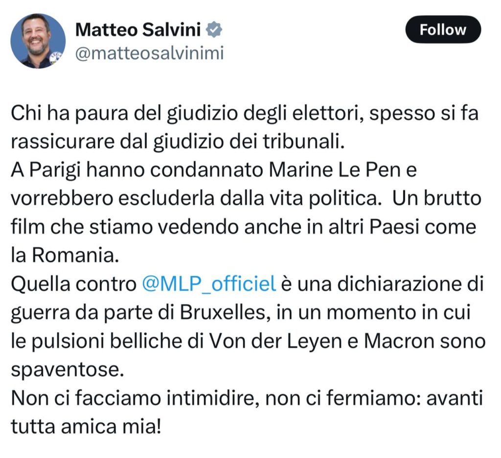 «Решение против Ле Пен – это объявление войны Брюсселем в то время, когда вызывают страх воинственные порывы главы ЕК и Макрона. Нас не запугать, нас не остановить: полный вперед, мой друг!» —призвал Сальвини.