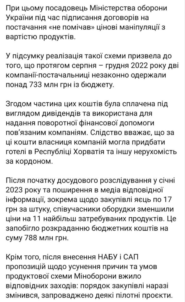 Таким образом, только за август–декабрь 2022 года два поставщика незаконно получили более 733 млн грн (почти $18 млн) из бюджета. А на яйцах хотели украсть 788 млн гривен (более $19 млн), но шумиха в прессе сорвала закупку.