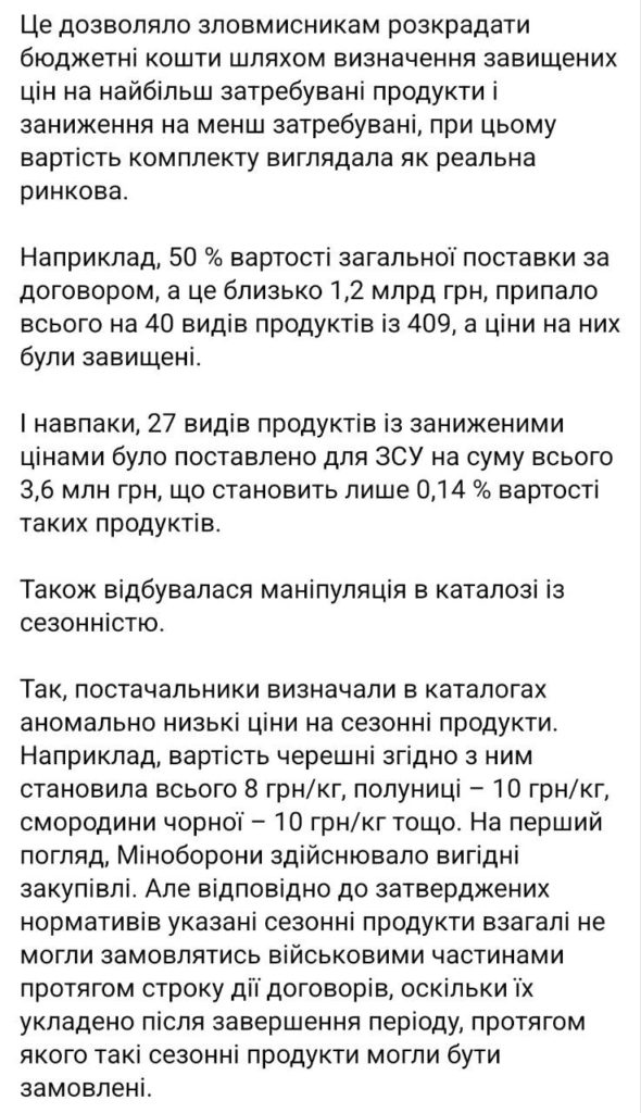 По версии следствия, ведомство в первые два года СВО завышало позиции одних продуктов и занижало других, оформляя при этом закупку сразу единого комплекта питания военных из 409 позиций. В том числе, это касается и резонансной истории с яйцами по 17 гривен (35 рублей) за штуку.