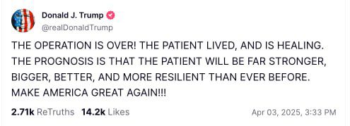 «Операция завершена! Пациент выжил и выздоравливает. По прогнозам, пациент станет намного сильнее, крупнее, лучше и жизнеустойчивее, чем когда-либо прежде», — написал Трамп.