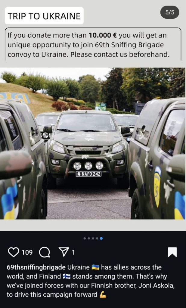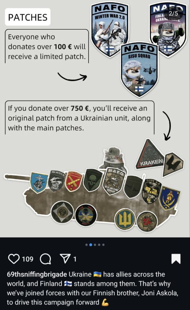 РИА Новости выяснило, что украинская благотворительная организация NAFO 69th Sniffing Brigade предлагает европейцам поездки в зону боевых действий и эксклюзивные товары с иностранной символикой в обмен на пожертвования для ВСУ. Информация об этом регулярно появляется в соцсетях организации