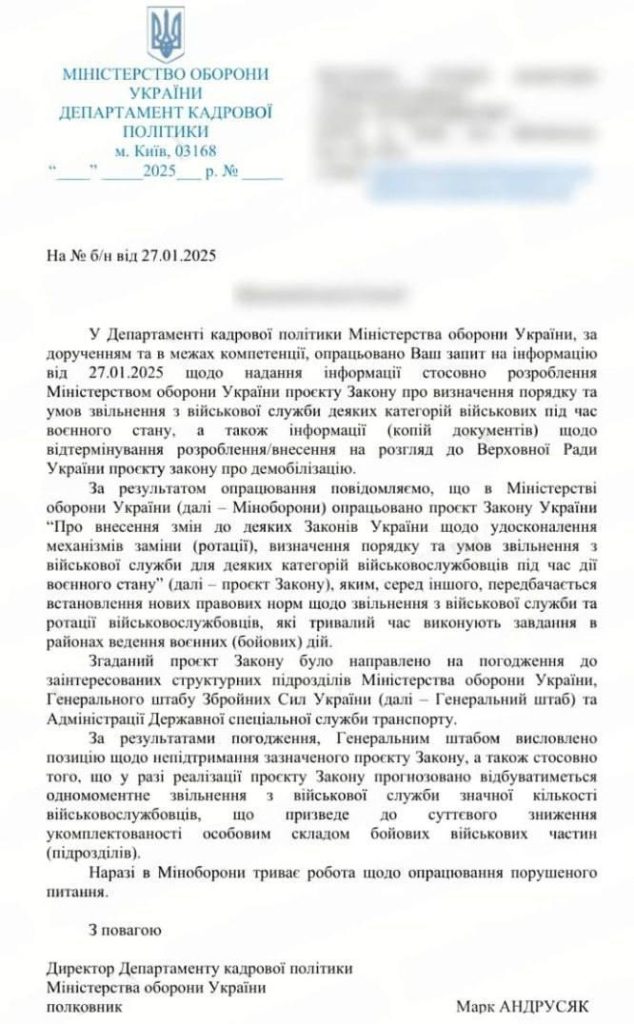 Министерство обороны Украины не представило в Верховную Раду законопроект, касающийся демобилизации военнослужащих, поскольку Генеральный штаб ВСУ выступил против этой инициативы. Такой ответ украинские СМИ получили на свой запрос в оборонное ведомство.