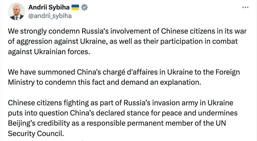 Министерство иностранных дел Украины вызвало поверенного в делах Китая в Киеве в связи с задержанием двух граждан КНР в Донецкой области, сообщил глава внешнеполитического ведомства Украины Андрей Сибига. По его словам, задержанные якобы участвовали в боевых действиях на стороне России.