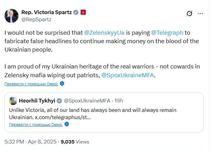Американская конгрессвумен Виктория Спартц прокомментировала слова спикера МИД Украины Георгия Тихого о том, что она больше не может считать себя украинкой.