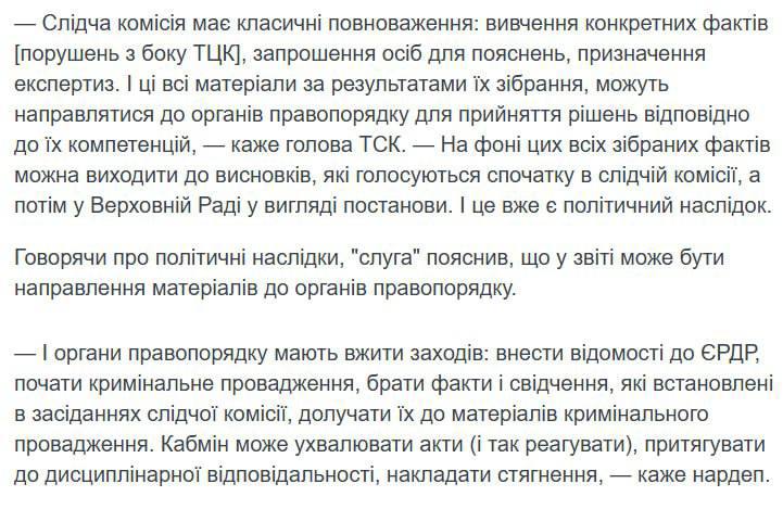 «Органы правопорядка должны принять меры: внести сведения в ЕРДР, открыть уголовное производство, принимать факты и показания, установленные в заседаниях следственной комиссии, приобщать их к материалам уголовного производства. Кабмин может принимать акты (и так реагировать), привлекать к дисциплинарной ответственности, налагать взыскание», — заявил нардеп.