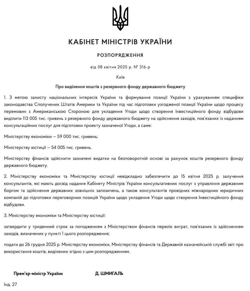 Правительство Украины выделило 113 млн гривен (более 2,7 млн долларов) на оплату услуг консультантов и юристов, привлеченных к работе по подготовке соглашения по природным ресурсам с Соединенными Штатами.