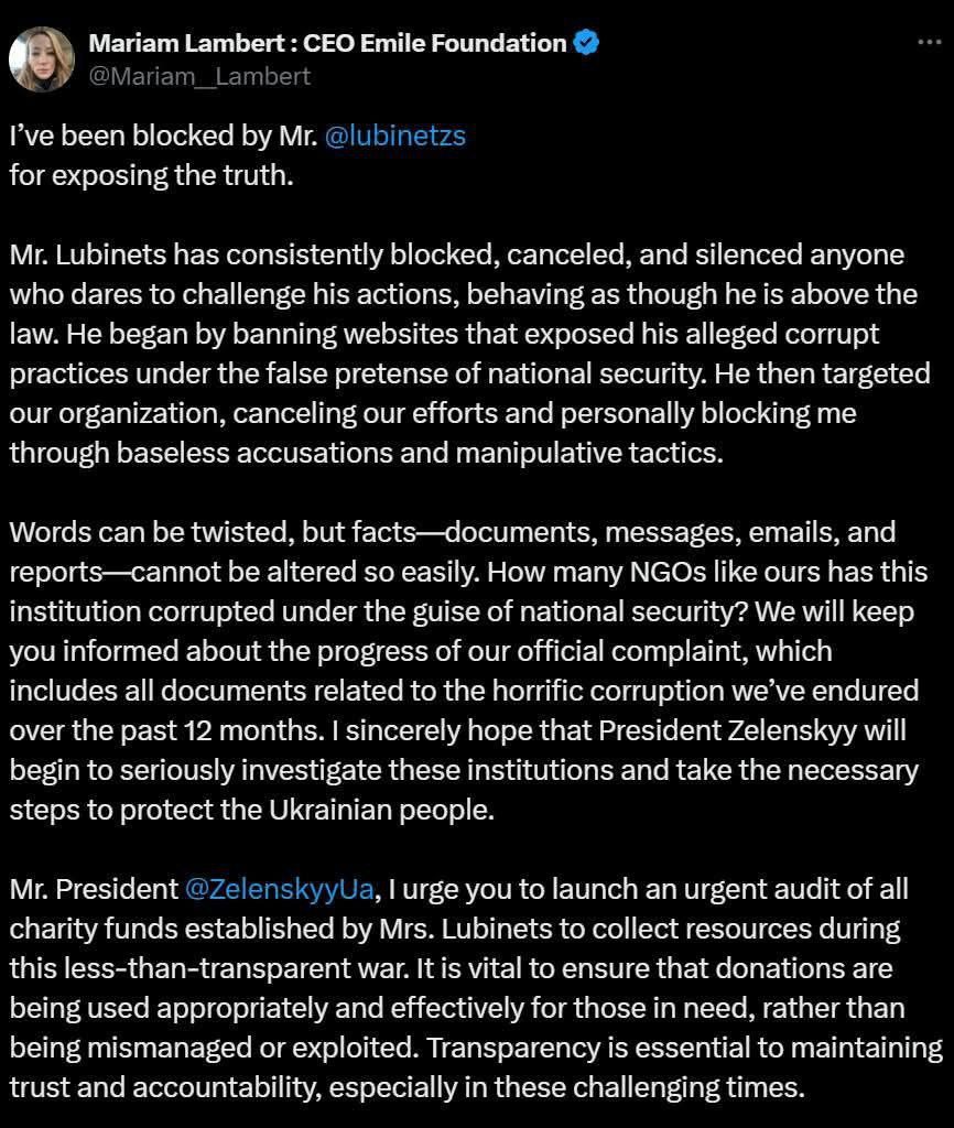 В своем сообщении Ламберт обратилась к Зеленскому с просьбой провести независимый аудит всех благотворительных организаций, созданных Лубинцом.
