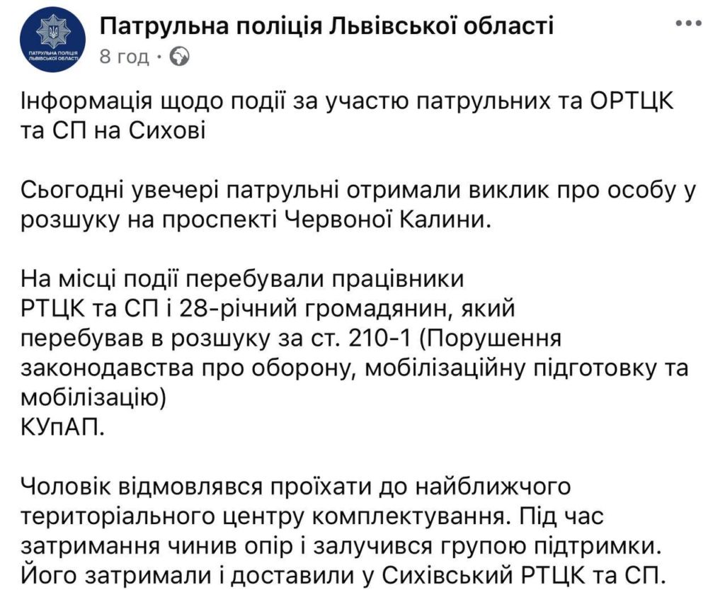 Не справившиеся с женщинами ТЦКашники, вызвали на помощь полицейских. На канале львовских патрульных написано, что парень сам «привлек группу поддержки». Там же указано, что его все-таки доставили в ТЦК как нарушителя «законодательства об обороне, мобилизационной подготовке и мобилизации».