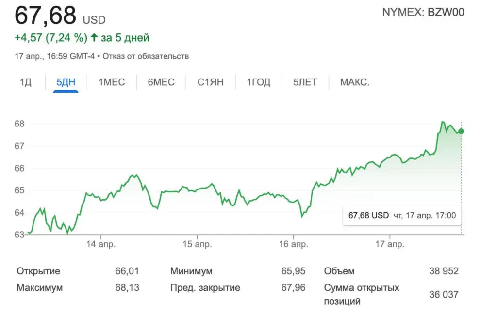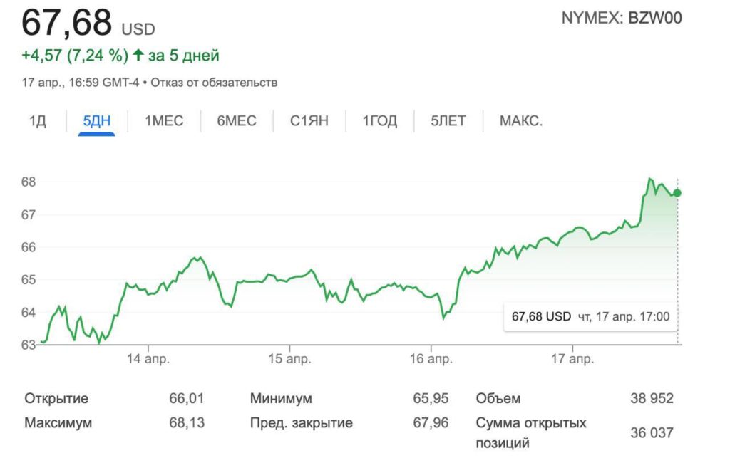 Марка Brent выросла на 7% за последние пять дней и стоит больше 67 долларов за баррель. WTI поднялась на 3% до 67,9 долларов.
