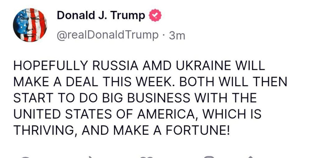 «Надеюсь, Россия и Украина заключат сделку на предстоящей неделе», — написал президент США в своей соцсети Truth Social.