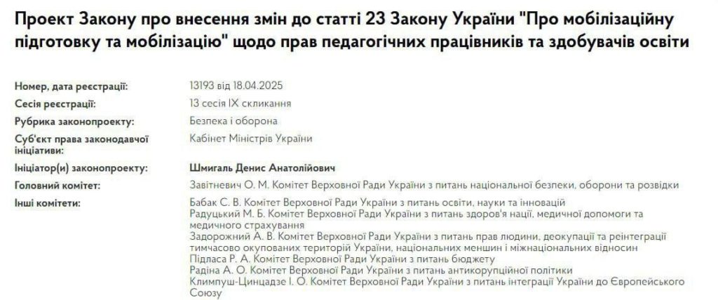 Кабинет Министров внес в Верховную Раду законопроект о внесении изменений в статью 23 Закона «О мобилизационной подготовке и мобилизации» относительно прав педагогических работников и студентов.
