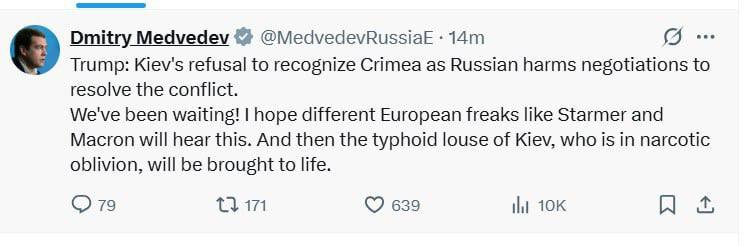 «Надеюсь, что различные европейские фрики, такие как Стармер и Макрон, это услышат. И затем киевская тифозная вошь, находящаяся в наркотическом забвении, придет в чувство»