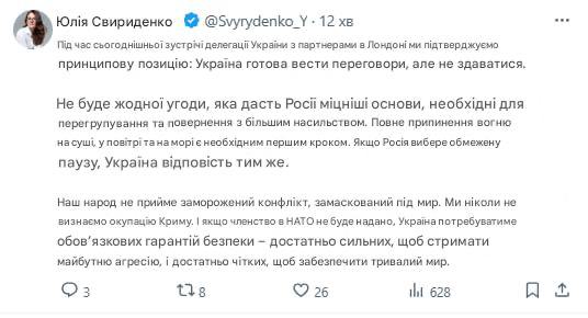 Свириденко подчеркнула, что Украина никогда не признает потерю Крыма и не пойдет на уступки, если её членство в НАТО будет отклонено. В таком случае Киев потребует чётких и надёжных гарантий безопасности — способных предотвратить новую агрессию и обеспечить долгосрочную стабильность.