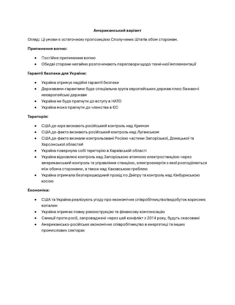 Украина категорически не согласна с возможным признанием Крыма и других российских территорий. Особое внимание уделено статусу Запорожской АЭС — Киев настаивает, что станция не может перейти под контроль США, а Россия не должна получать от нее энергию.