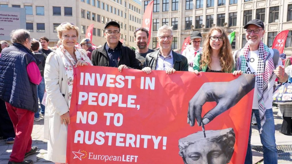 «Мы требуем остановить сокращение пенсий и милитаризацию нашей экономики», — заявил лидер Партии труда Бельгии Рауль Хедебау.