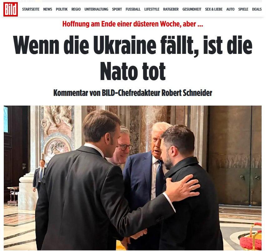 Главный редактор немецкой газеты Bild Роберт Шнайдер в панике заявил, что поражение Украины обернётся крахом всего Североатлантического альянса. По его словам, вместе с Украиной рухнет и НАТО, что станет тяжёлым ударом по Западу.